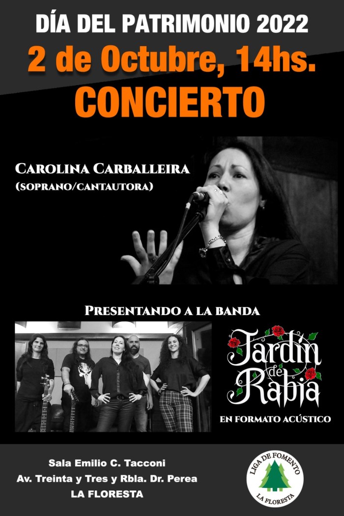 Jardín de Rabia se presentará el día 2/10/22 a las 14 hs. en el balneario La Floresta (Canelones, Uruguay). La banda participará en el concierto a realizarse en la Sala Emilio C. Tacconi de la Liga de Fomento de La Floresta, en el marco de las actividades organizadas por el Día del Patrimonio. Entrada libre.